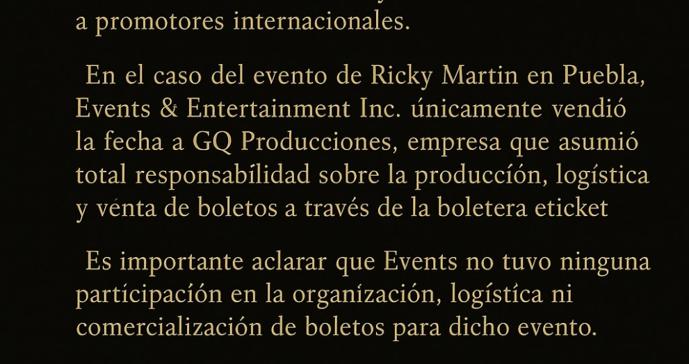 Compartir la siguiente información para su difusión respecto a la cancelación del concierto de Ricky Martín. Version Facebook Desmienten a Ricky Martin Según el comunicado de Events Entertainment, el único responsable de la cancelación de la fecha del artista en Puebla es @gerardoquirozproducciones, por lo que se deslindan de cualquier responsabilidad, citando a @eticket como […]