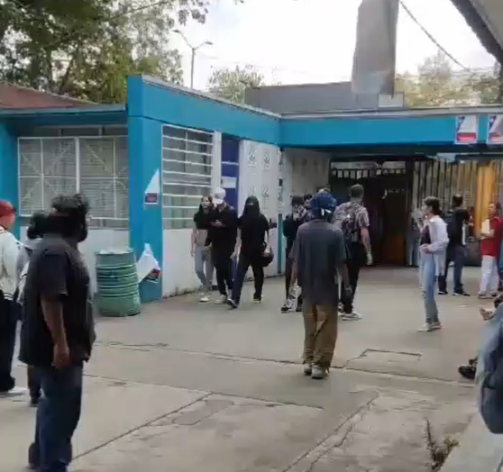 CD DE MÉXICO.- Toman las instalaciones del Colegio de Ciencias y Humanidades CCH Vallejo de la UNAM, ubicado en la avenida de los 100 Metros, en la alcaldía Gustavo A. Madero de la Ciudad de México. Autoridades del plantel aseguraron que “porros vestidos de negro” entraron a las instalaciones.
