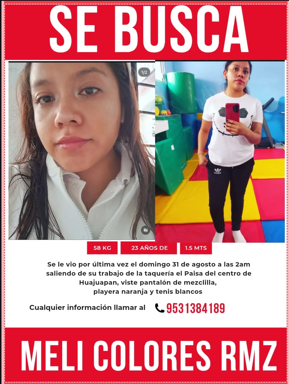 #Local #Periodico SE BUSCA Responde al nombre de *Mely Cecilia Colores Ramírez.* Fue vista por última vez el domingo 31 de agosto a las (76)