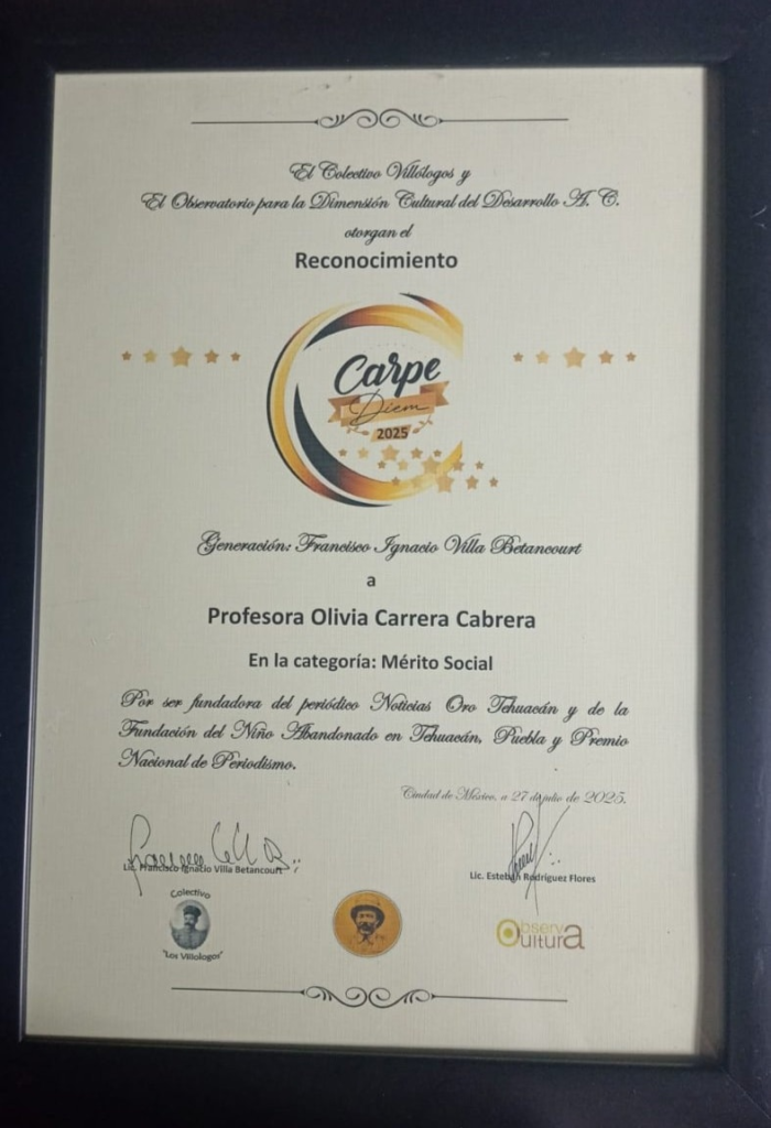 Recibe la Maestra Olivia Olivia Carrera Cabrera el Premio CARPE DIEM en el centro Veracruzano de la ciudad de México en su categoría Mérito social por: